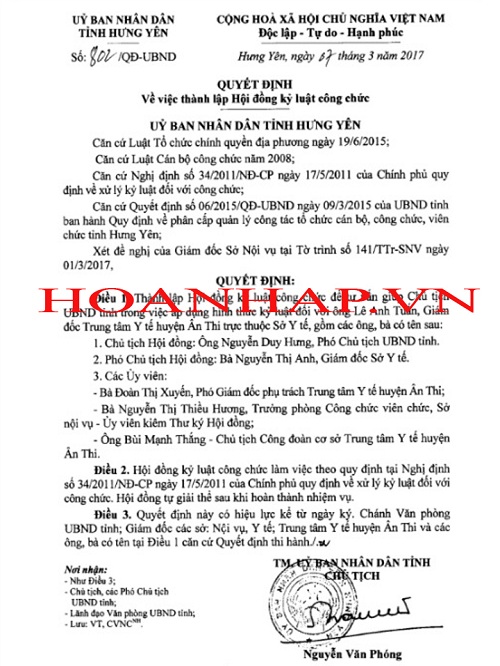 Quyết định thành lập Hội đồng kỷ luật công chức của UBND tỉnh Hưng Yên.