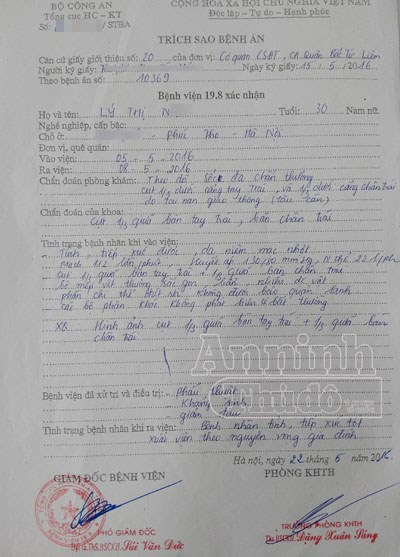 | Trích sao bệnh án của chị Lý Thị N. tại Bệnh viện 19-8 (Ảnh cơ quan công an cung cấp) |
