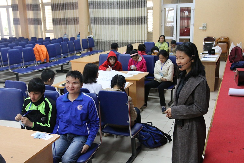Đào Thu Hương đứng lớp chia sẻ trong buổi học hướng nghiệp cho học sinh, sinh viên khiếm thị.