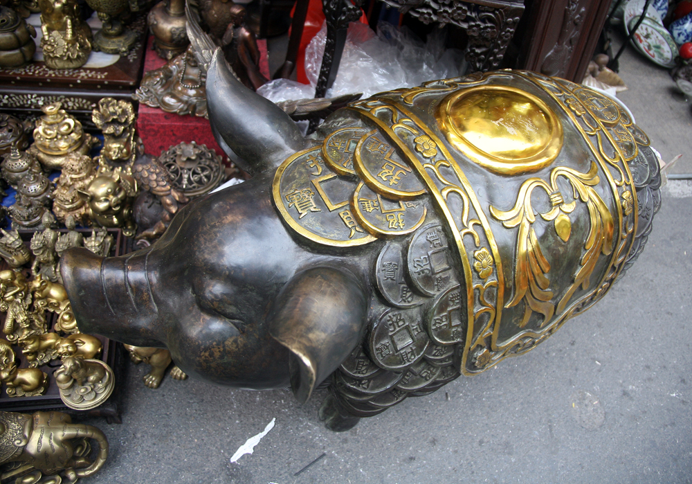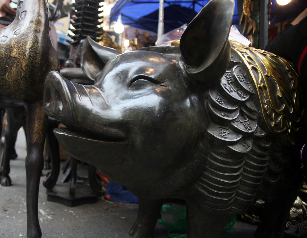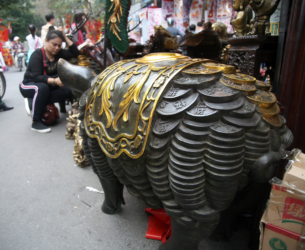 Tại ngã tư Hàng Lược, Hàng Mã (Hoàn Kiếm – Hà Nội), những ngày vừa qua rất nhiều người dân không khỏi choáng ngợp trước cặp lợn đúc đồng với tỷ lệ như một chú lợn trưởng thành được bày bán.