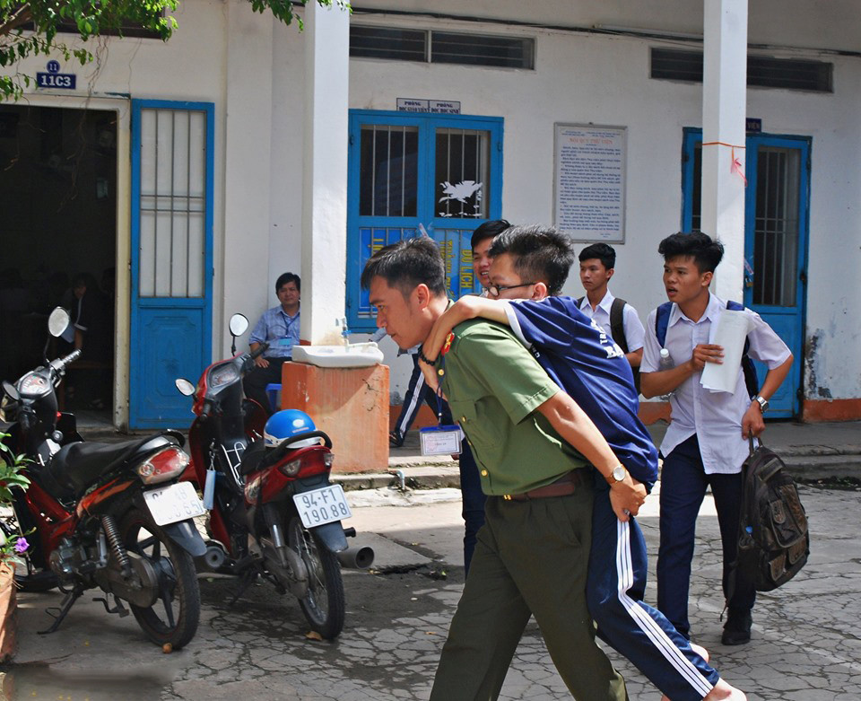 Hình ảnh một chiến sĩ an ninh cõng một thí sinh bị xương thủy tinh tham gia kỳ thi THPT Quốc gia 2019, đã khiến cộng đồng mạng không ngớt lời khen ngợi. Những khoảnh khắc đẹp được ghi lại tại một điểm thi ở Bạc Liêu.