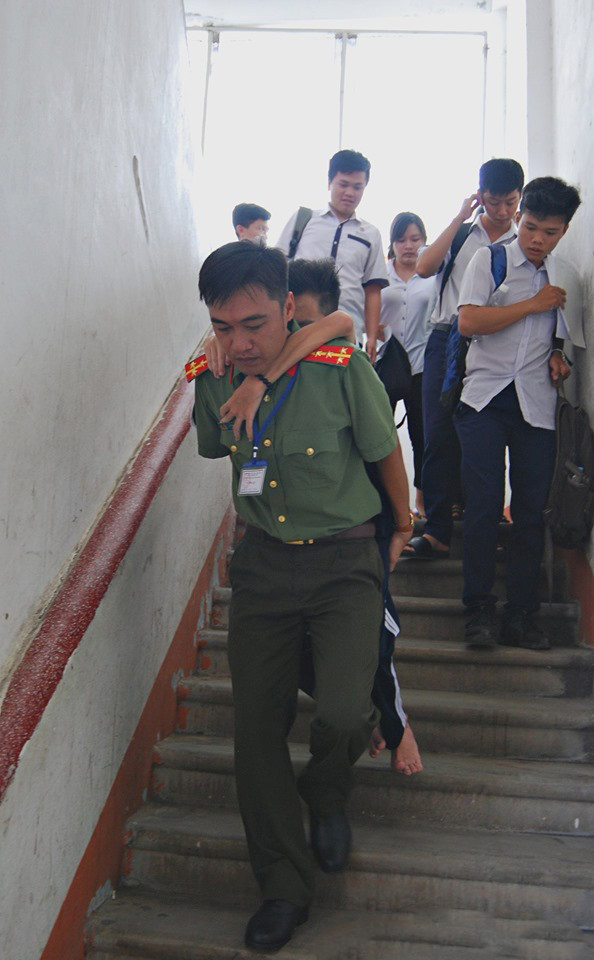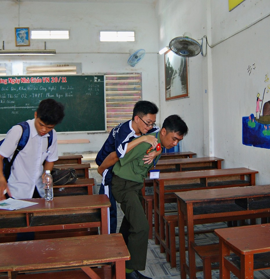 Những tấm ảnh ghi lại cảnh một chiến sĩ mặc sắc phục an ninh hỗ trợ một thí sinh mắc bệnh, không thể tự đi lại được. Từng tấm ảnh ghi lại khoảnh khắc người chiến sĩ này bỏ bút, thước vào cặp, đỡ thí sinh đứng dậy, cõng cậu ra vào phòng thi,… một cách rất cẩn thận. Cạnh đó, có một học sinh khác là thí sinh ngồi cạnh bàn của cậu cũng hỗ trợ rất nhiệt tình.