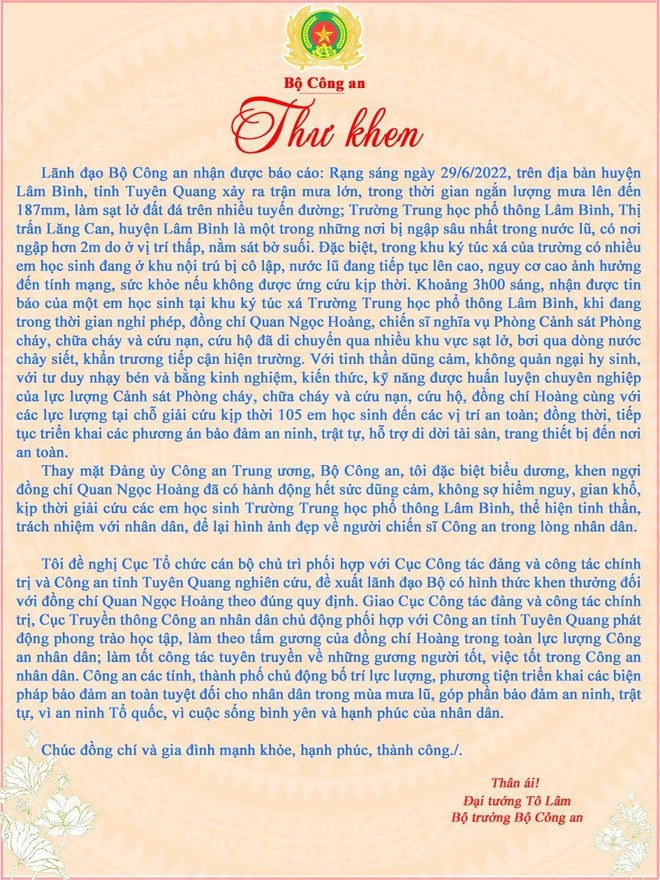 Trước tinh thần, hành động dũng cảm của Binh nhì Quan Ngọc Hoàng, Bộ trưởng Bộ Công an Tô Lâm đã có thư khen. Hành động của đồng chí góp phần tô thắm thêm truyền thống của lực lượng Cảnh sát nhân dân./.