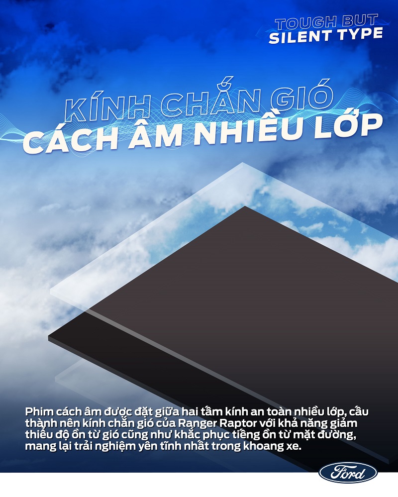 Kính chắn gió trên Ranger Raptor không chỉ có nhiệm vụ bảo vệ hành khách trong chuyến đi. Phim cách âm được đặt giữa hai tấm kính an toàn nhiều lớp, cấu thành nên kính chắn gió có khả năng giảm thiểu độ ồn từ gió cũng như khắc phục tiếng ồn từ mặt đường, mang lại trải nghiệm lái yên tĩnh nhất cho những hành khách trong khoang xe.