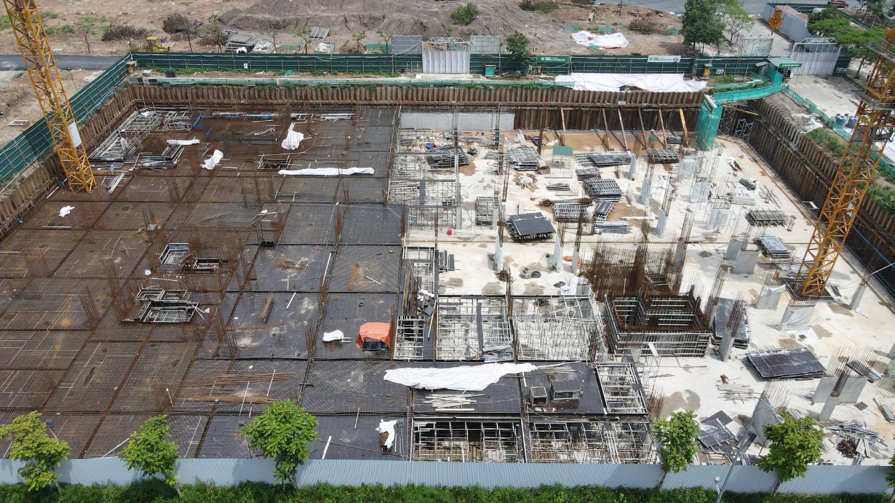Đã đổ bê tông sàn hầm từ trục MC - RA + 11,93m x R10 - R12 + 7,14m, diện tích khoảng 611m2; Ghép cốt pha, sắt thép sàn hầm 1 từ trục: MC - RA + 11,93m x R10 - R1 + 9,3m; Đổ 6 cột hầm tầng 1.
