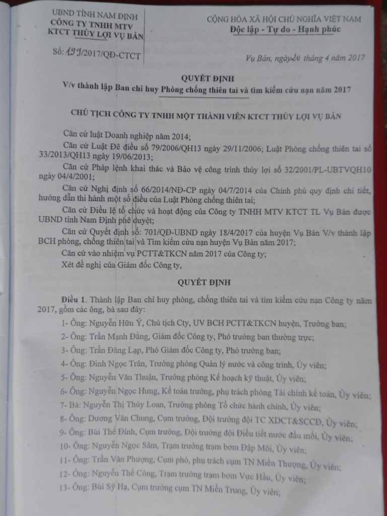 | Quyết định của Công ty TNHH MTV khai thác công trình thủy lợi huyện Vụ Bản, tỉnh Nam Định về việc thành lập Ban chỉ huy PCTT&TKCN năm 2017. |