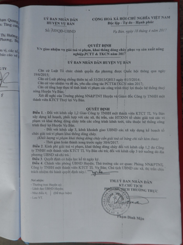 | Quyết định của UBND huyện Vụ Bản, tỉnh Nam Định giao nhiệm vụ giải tỏa vi phạm, khai thông dòng chảy phục vụ sản xuất nông nghiệp, PCTT&TKCN năm 2017. |