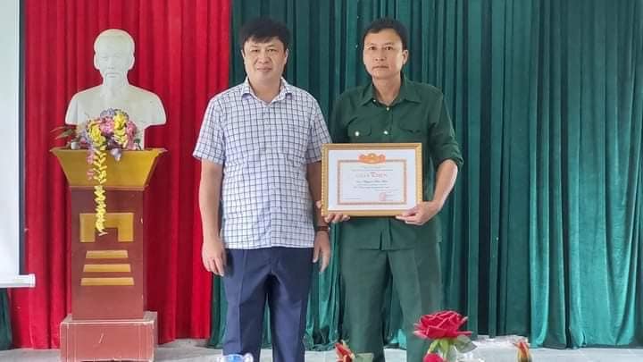 Phó chủ tịch UBND huyện Thanh Chương tặng bằng khen cho ông Nguyễn Hữu Hiền đã dũng cảm cứu người.