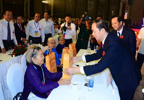 Phát biểu tại hội nghị, thay mặt lãnh đạo Đảng, Nhà nước, Chủ tịch nước Trần Đại Quang trân trọng đánh giá cao và nhiệt liệt biểu dương các Mẹ Việt Nam Anh hùng, Anh hùng Lực lượng vũ trang nhân dân, Anh hùng Lao động, các thương binh, bệnh binh, thân nhân liệt sĩ, gia đình người có công với cách mạng đã phát huy truyền thống anh hùng vẻ vang, nỗ lực phấn đấu vươn lên, tiếp tục góp phần to lớn vào sự nghiệp đổi mới, xây dựng và bảo vệ Tổ quốc.