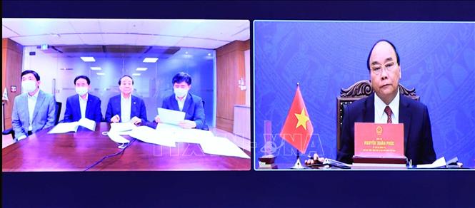 Chủ tịch nước Nguyễn Xuân Phúc tại buổi làm việc trực tuyến với ông Choi Young Joo. Ảnh: TTXVN