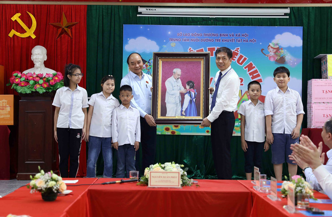 Chủ tịch nước Nguyễn Xuân Phúc tặng bức tranh Chủ tịch Hồ Chí Minh với thiếu nhi cho Trung tâm Nuôi dưỡng trẻ khuyết tật Hà Nội (Ảnh: TTXVN)\