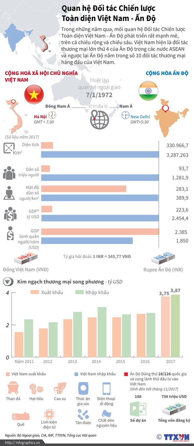 Trong đó, quan hệ kinh tế, thương mại được Chính phủ hai nước xác định là một trong những trụ cột của mối quan hệ Đối tác Chiến lược Việt Nam-Ấn Độ.