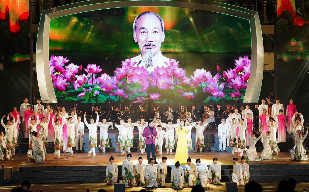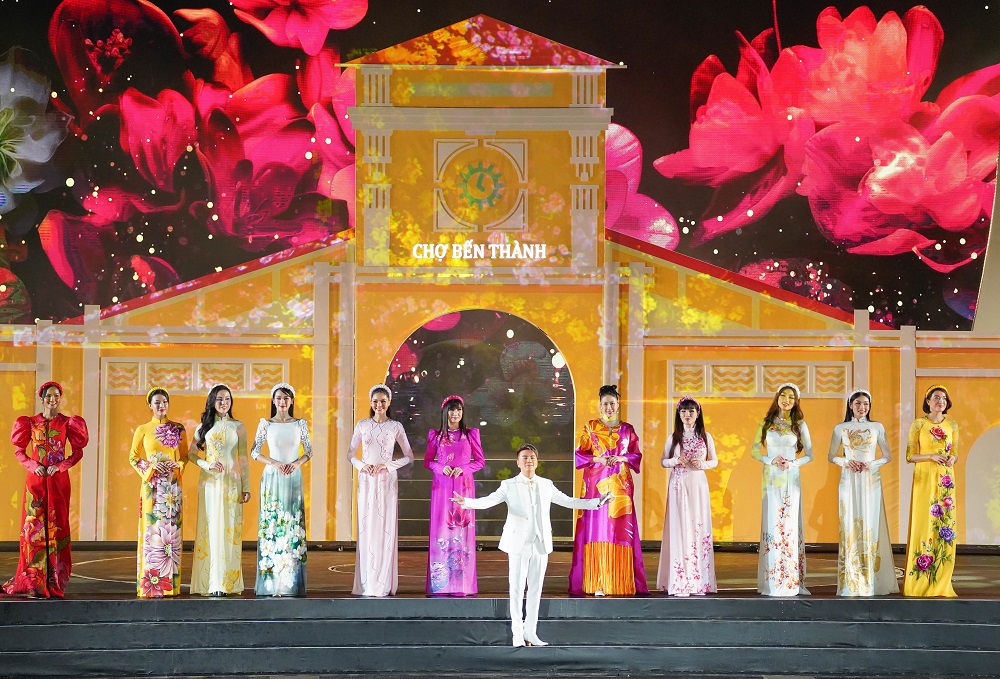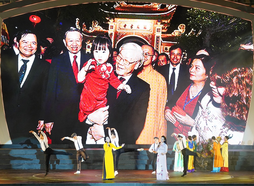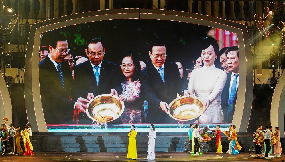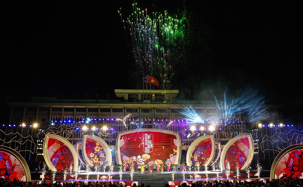 Sau lời chúc Tết của Chủ tịch nước Nguyễn Văn Thưởng, toàn thể kiều vào và nhân dân TP Hồ Chí Minh, quý lãnh đạo thưởng thức gần 20 tiết mục văn nghệ qua 2 chương trình diễn gồm: Viết tiếp thiên hùng ca và Tự hào Thành phố mang tến Bác.