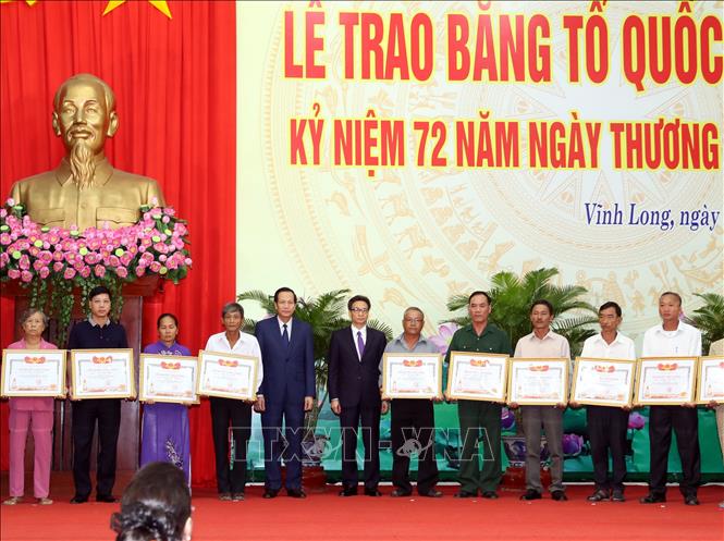 Kỷ niệm 72 năm Ngày Thương binh-Liệt sĩ, sáng 22/7, tại tỉnh Vĩnh Long, Bộ Lao động-Thương binh và Xã hội, UBND tỉnh Vĩnh Long đã tổ chức Lễ trao Bằng Tổ quốc ghi công cho 72 thân nhân liệt sĩ, đại diện cho 468 thân nhân liệt sĩ trong cả nước.