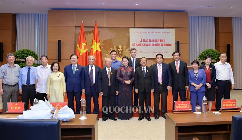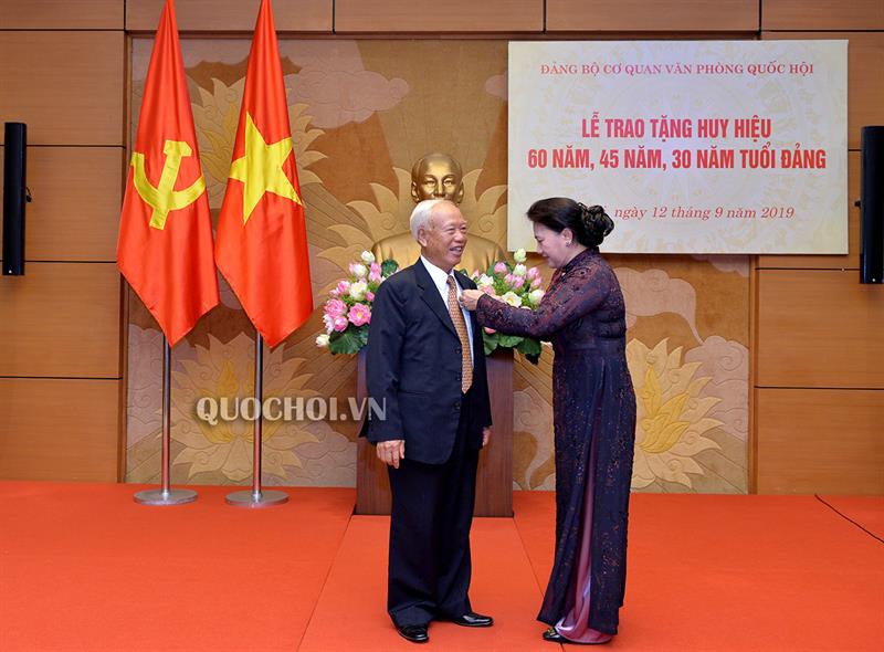 Tại buổi lễ, Chủ tịch Quốc hội Nguyễn Thị Kim Ngân đã trao tặng Huy hiệu 60 năm tuổi Đảng cho nguyên Ủy viên Bộ Chính trị, nguyên Bí thư Đảng đoàn Quốc hội, nguyên Chủ tịch Quốc hội Nguyễn Văn An; trao tặng Huy hiệu 45 năm tuổi Đảng cho Phó Chủ tịch Quốc hội, Đại tướng Đỗ Bá Tỵ.