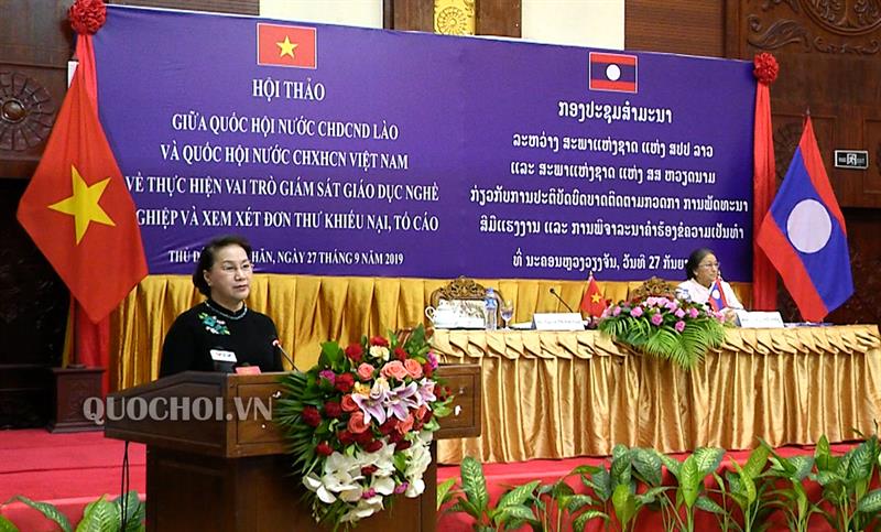 Chủ tịch Quốc hội Nguyễn Thị Kim Ngân và Chủ tịch Quốc hội Lào Pany Yathotou đã đồng chủ trì Hội thảo chuyên đề “Chính sách pháp luật về giáo dục nghề nghiệp và giải quyết việc làm” và “Công tác phối hợp xử lý đơn thư khiếu nại tố cáo giữa các cơ quan Quốc hội và Chính phủ và các bộ, ngành liên quan".