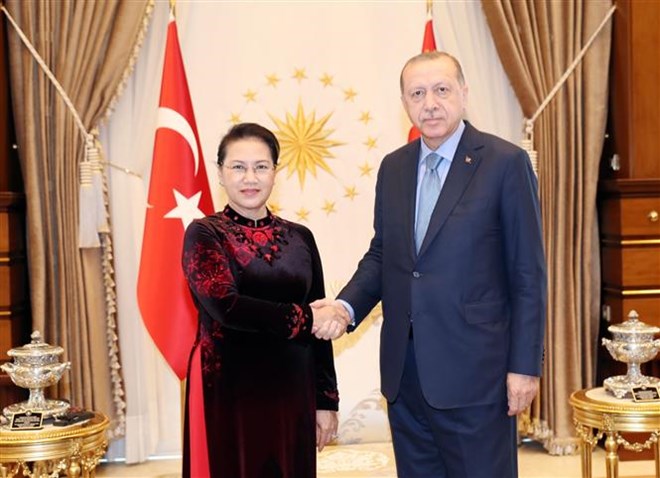 | Chủ tịch Quốc hội Nguyễn Thị Kim Ngân hội kiến Tổng thống Thổ Nhĩ Kỳ Recep Tayyip Erdogan. Ảnh: TTXVN |
