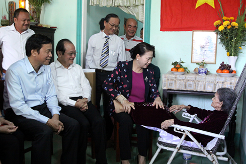 Chủ tịch Quốc hội Nguyễn Thị Kim Ngân đã đến thăm hỏi, động viên các gia đình chính sách, cán bộ cách mạng lão thành. Chủ tịch Quốc hội ân cần thăm hỏi tình hình sức khỏe và đời sống các đối tượng, gia đình chính sách và cán bộ lão thành cách mạng; bày tỏ lòng biết ơn sâu sắc đến các gia đình liệt sĩ, thương binh, bệnh binh đã có nhiều đóng góp cho sự nghiệp xây dựng và bảo vệ Tổ quốc.