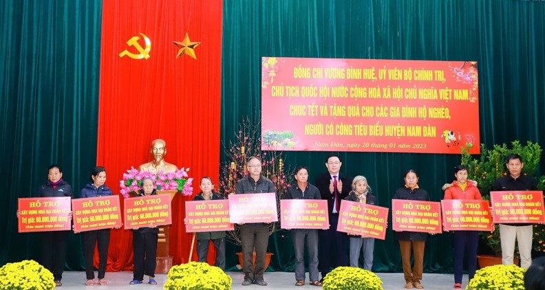 Tại chương trình, Chủ tịch Quốc hội Vương Đình Huệ trao tặng kinh phí hỗ trợ xây dựng 10 căn nhà đại đoàn kết, mỗi căn nhà 60 triệu đồng cho 10 hộ nghèo khó khăn về nhà ở; trao 10 suất quà cho gia đình có công tiêu biểu; 200 suất quà cho các gia đình chính sách và các gia đình có hoàn cảnh khó khăn trên địa bàn huyện Nam Đàn.