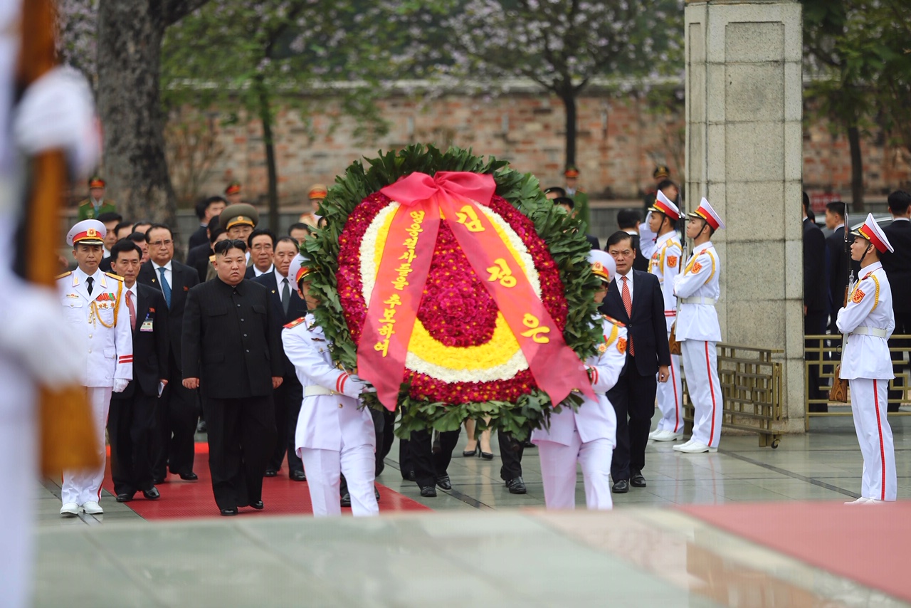 | Trước khi rời Hà Nội để đi Lạng Sơn, Chủ tịch Triều Tiên Kim Jong Un đến đặt vòng hoa và vào Lăng viếng Chủ tịch Hồ Chí Minh. |