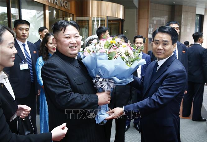 | Chủ tịch UBND TP Hà Nội Nguyễn Đức Chung tặng hoa, tiễn Chủ tịch Triều Tiên Kim Jong Un tại khách sạn Melia (Hà Nội). |