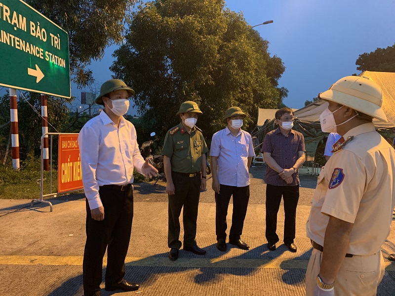 Đồng chí Triệu Thế Hùng, Phó Bí thư Tỉnh ủy, Chủ tịch UBND tỉnh kiểm tra chốt phòng dịch tại đường cao tốc Hà Nội - Hải Phòng đi xuống Quốc lộ 38B.