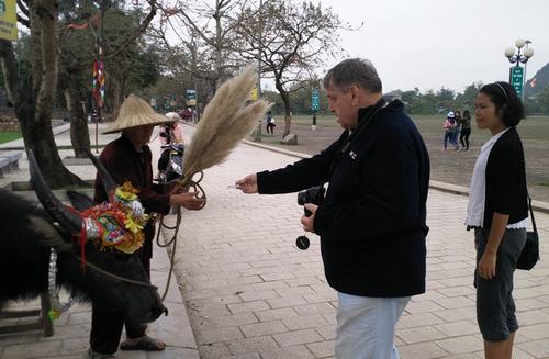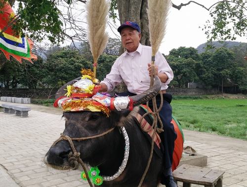 Đang kể chuyện về con “trâu vàng” của mình, có đoàn du khách từ Hà Nội đến hỏi chuyện, cụ Vi lại nhiệt tình giới thiệu du khách ngồi lên lưng trâu, phất cao ngọn cờ lau như hình ảnh anh hùng Đinh Bộ Lĩnh xưa kia dẹp loạn 12 xứ quân. Qua lời giới thiệu hóm hỉnh của cụ Vi, hai du khách nam đã thích thú đồng ý để cưỡi lên lưng trâu, cầm cờ lau, chụp ảnh lưu niệm.