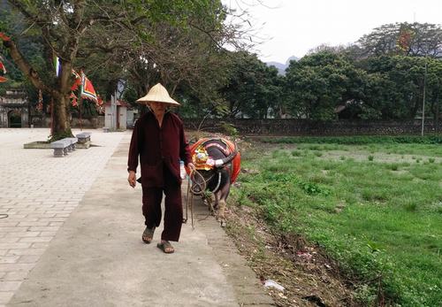 Ở Trường Yên, người làm nghề như cụ Vi được coi là hiếm vì không phải ai cũng thích hợp với công việc này. “Con trâu này vợ chồng tôi nuôi được 9 năm rồi. Trước kia tôi thường cho trâu đi cày cả ruộng nhà và ruộng thuê để kiếm thu nhập. Nhưng giờ tuổi cao sức yếu không cày bừa được nữa nên làm cái nghề "chẳng giống ai" này để kiếm bó rau, cân gạo sống qua ngày” - cụ Vi tâm sự.