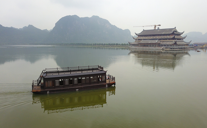 | Khu nhà hội nghị quốc tế nằm trong quần thể Chùa Tam Chúc với mô hình giống chiếc thuyền nổi trên mặt hồ. |