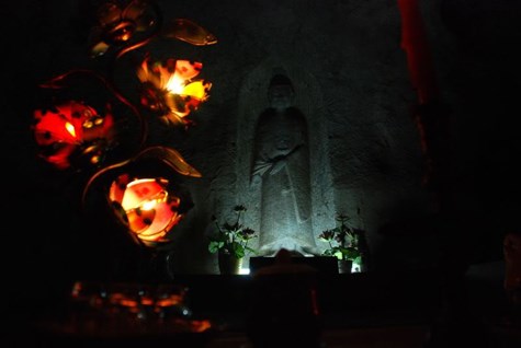 Tượng phật A Di Đà màu trắng được tạc vào vách đá trong hang động (Ảnh: ST)