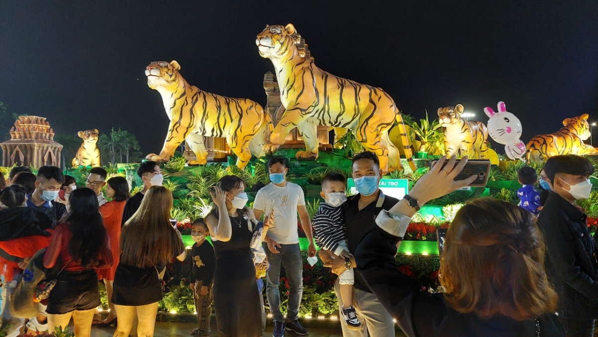 Tại cụm biểu tượng linh vật năm Nhâm Dần 2022 được trưng bày tại Quảng trường Nguyễn Tất Thành, thành phố Quy Nhơn có nhiều bạn trẻ mặc áo dài đến vui chơi, check in. Để đảm bảo công tác phòng chống dịch trong ngày Tết, Ngành Y tế Bình Định khuyến cáo người dân du xuân cần thực hiện tốt thông điệp 5K.