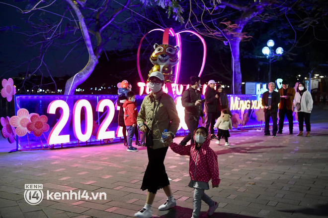 Từ chiều 31/1 (29 Tết), quanh khu vực Hồ gươm và quảng trường Đông Kinh Nghĩa Thục, người dân đổ ra đường tản bộ và chụp ảnh trước không khí giao thừa.Hơn 20h, hàng chục người vẫn đứng dưới trời rét 13 độ C bán đào trên đường Tố Hữu.