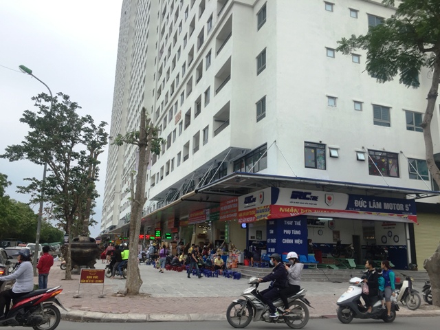 | Phía dưới chung cư là dãy hàng quán lộn xộn. |