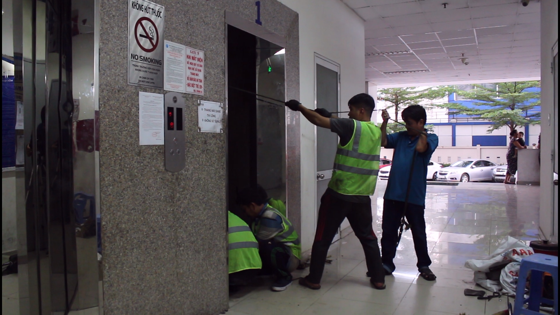 | Các công nhân đang thay thế các hệ thống thang máy |