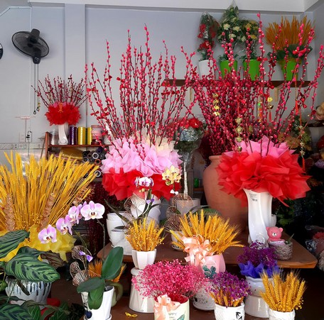 Bên cạnh đó, năm nay các sản phẩm hoa giả được sản xuất chất lượng, ngày càng giống hoa thật nên cũng được nhiều người ưa chuộng. Hoa cành lẻ hồng, đào, mai, tulip, lan, nụ tầm xuân... 25.000- 60.000 đ/cành, bông lúa mạch vàng 30.000- 45.000 đ/100 bông, các mẫu bình hoa giả cắm sẵn từ 200.000- 2.000.000 triệu đồng/bình.