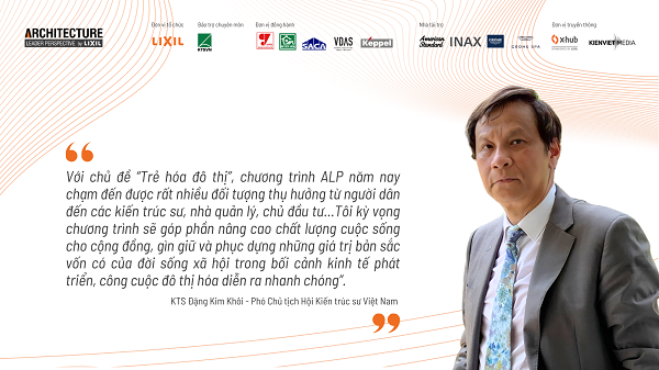 Đại diện Đơn vị Bảo trợ Chuyên môn, KTS Đặng Kim Khôi - Phó Chủ tịch Hội Kiến trúc sư Việt Nam chia sẻ: “Không gian sống là phương diện quan trọng, có sự thay đổi theo thời gian tùy thuộc vào suy nghĩ, trình độ nhận thức, điều kiện kinh tế, sự biến động của đời sống, sự phát triển của khoa học công nghệ…Trong kiến trúc đương đại, sự đổi thay đó gọi là “trẻ hóa”, được hiểu là việc chuyển đổi một phần hay toàn bộ, mang lại sức sống mới cho một công trình, một khu phố, một đô thị hay cả một thành phố. Với chủ đề “Trẻ hóa đô thị”, chương trình ALP năm nay chạm đến được rất nhiều đối tượng thụ hưởng từ người dân đến các kiến trúc sư, nhà quản lý, chủ đầu tư…Tôi kỳ vọng chương trình sẽ góp phần nâng cao chất lượng cuộc sống cho cộng đồng, gìn giữ và phục dựng những giá trị bản sắc vốn có của đời sống xã hội trong bối cảnh kinh tế phát triển, công cuộc đô thị hóa diễn ra nhanh chóng”.