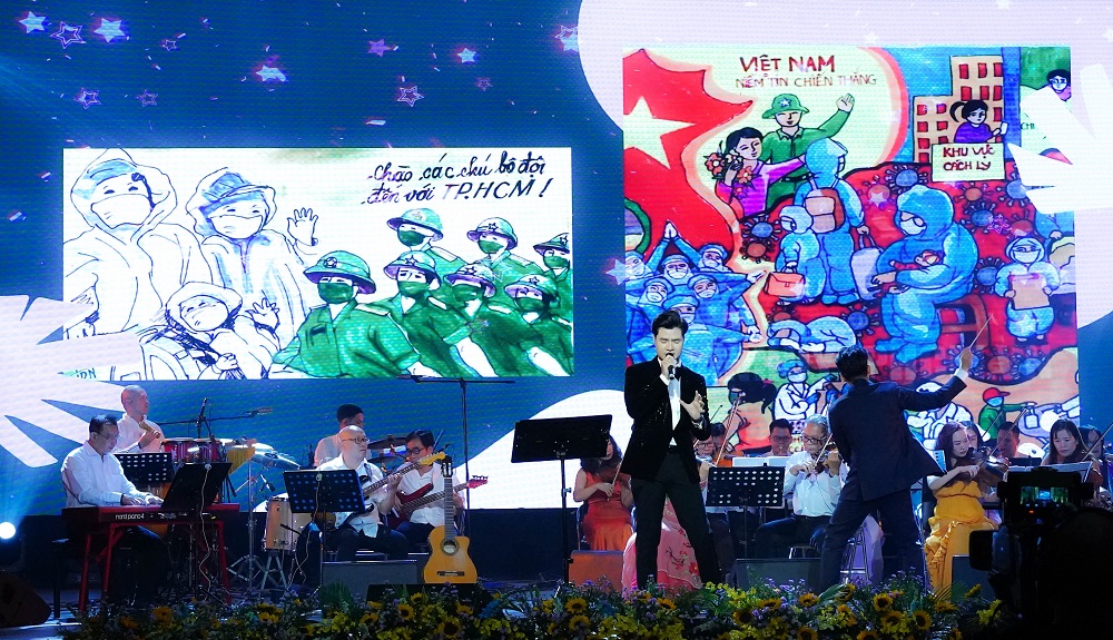 Những hình ảnh vẽ tay xuyên suốt quá trình TP Hồ Chí Minh cùng cả nước chiến đấu với đại dịch COVID-19 được thể hiện xen lẫn giữa tiếc mục văn nghệ.