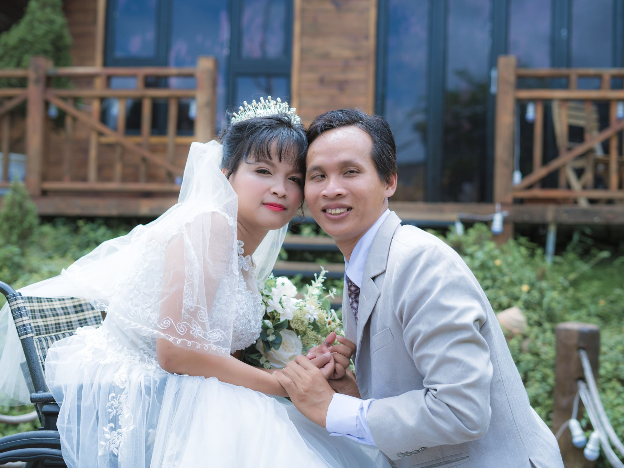 Trong hình là buổi chụp hình cưới của vợ chồng chị Lê Thị Nhánh, 58 tuổi và anh Ngô Thuần, 61 tuổi vào đầu năm 2017. Lúc anh Huynh xuống nhà lấy số đo để chuẩn bị quần áo thấy cả hai vợ chồng đều liệt nên về mua đồ đóng ngay hai cái bàn kéo để giúp họ di chuyển trong lúc chụp.