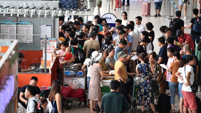 Trong buổi chiều, dọc lối đi tại các sảnh nhà ga T1 Cảng hàng không Nội Bài, hành khách Vietjet Air ngồi chật kín để chờ đợi đến giờ lên máy bay.