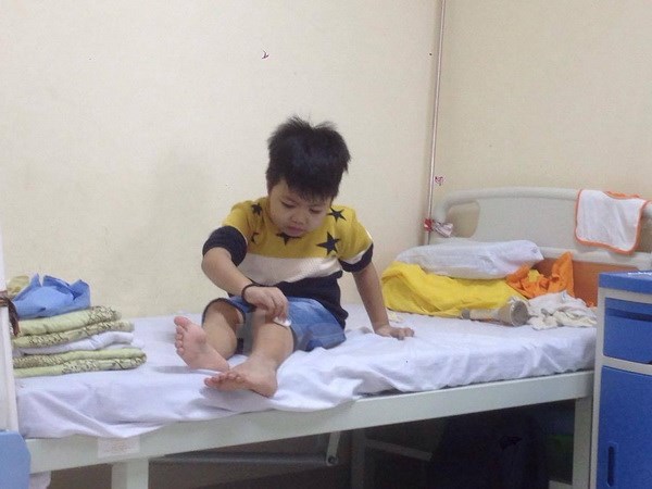 Bé Trương Hoàng Phúc, 7 tuổi, con trai của chị Hoa mắc bệnh tan máu bẩm sinh và chân đi lại khó khăn vì bại liệt một phần di chứng của cơn sốt khi bé 2 tuổi.