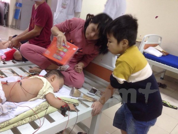 Bé Phúc bên cạnh em nhỏ cùng phòng bệnh. (Ảnh: PV/Vietnam+)