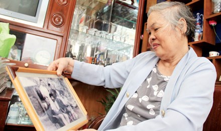 | Bà Lịch xem lại những tấm ảnh kỷ niệm thời chiến. |