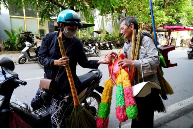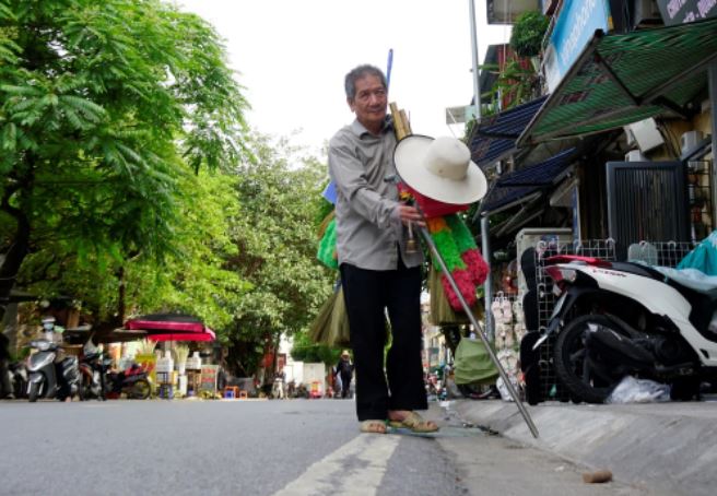 Ông cụ 71 tuổi cho biết trước đây mắt ông còn nhìn thấy mờ mờ, ông đẩy xe đi bán khắp khu Hoàn Kiếm, Ba Đình, chổi chít của ông có thương hiệu, nhiều người mua thích.