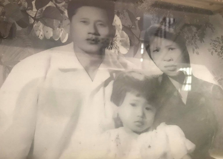 Vợ chồng ông Thiều Giữ cùng con gái đầu lòng năm 1973. Ảnh do nhân vật cung cấp