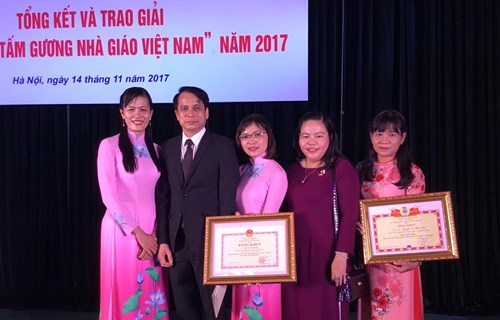 | Cô Tâm (bên trái), thứ Trưởng Phạm Mạnh Hùng và cô giáo Hồ Thị Kim Hạnh chụp ảnh lưu niệm tại lễ tổng kết và trao giải cuộc thi Nhà giáo Việt Nam 2017 |