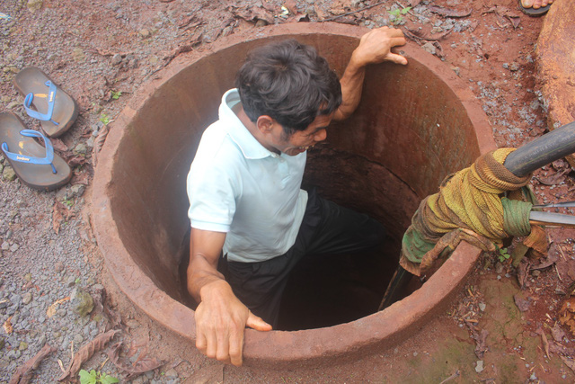 | Mặc dù không thấy đường nhưng anh Gih vẫn đào nên những chiếc giếng tròn, đầy tràn nước. ẢNH: Đức Huy |