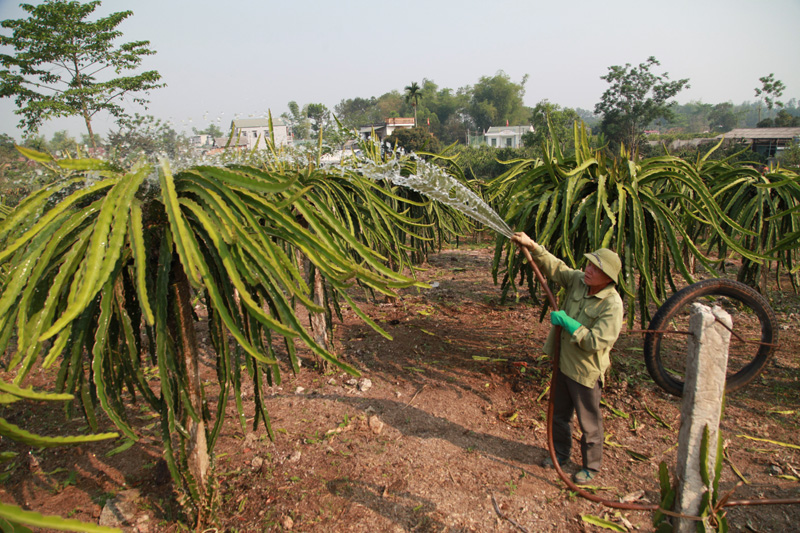 | Cựu chiến binh Nguyễn Xuân Khôi chăm sóc vườn cây thanh long. |