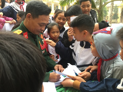 Câu chuyện về những năm tháng chiến đấu hào hùng, oanh liệt ấy vẫn đang được tái hiện tại các trường học tại Hà Nội vào những buổi sinh hoạt ngoài giờ. Trong một lần tác nghiệp, tôi có “nghe ngóng” được các bác cựu chiến binh kể chuyện chiến trường cho học sinh nghe, thấy các em học sinh chăm chú, mải mê nghe lắm. Các bác kể những câu chuyện thực tế mà các bác là những nhân chứng lịch sử, trực tiếp tham gia các trận đánh tại chiến trường năm xưa, các bác có cách kể chuyện rất tự nhiên, pha chút hài hước cùng những nụ cười “rất bộ đội”, đôi lúc diễn tả cảnh xung trận thật oai hùng. Sau buổi trò chuyện các em học sinh vây quay các bác cựu chiến binh để chụp ảnh chung và xin chữ ký, như thể người hâm mộ đang vây quay các cầu thủ bóng đá vậy.