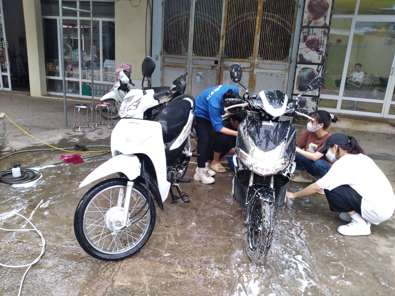 Các thợ rửa xe “nghiệp dư” miệt mài làm việc.