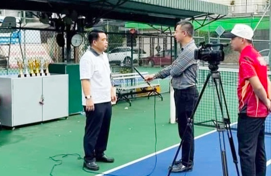 Ông Huỳnh Thanh Điền - Nguyên phó Chủ tịch UBND tỉnh - Chủ tịch liên đoàn quần vợt Nghệ An trả lời báo chí trong lúc kiểm tra công tác chuẩn bị.